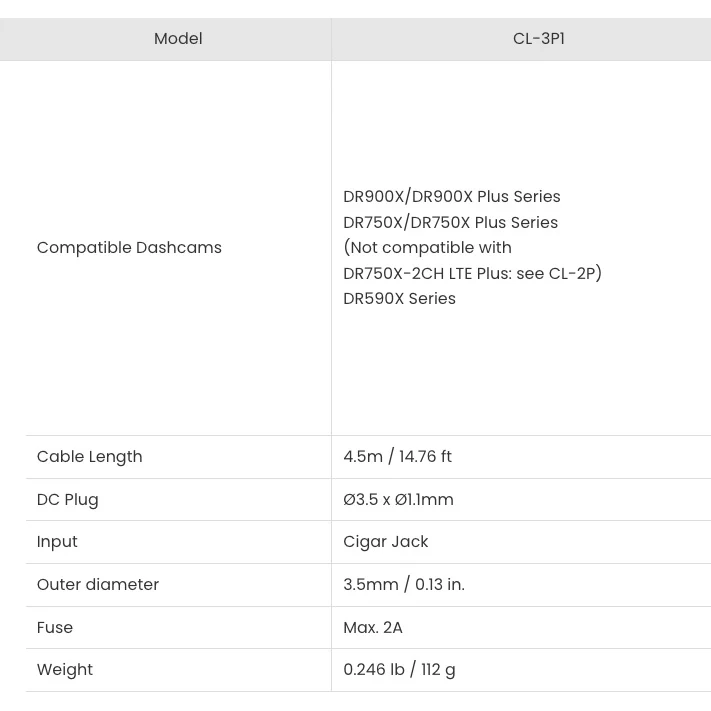 Note that the connector on this lead has 3 pins (Ground/Live/Ignition) which is used by most of the X series cameras - check compatibility with your BlackVue model before purchasing.